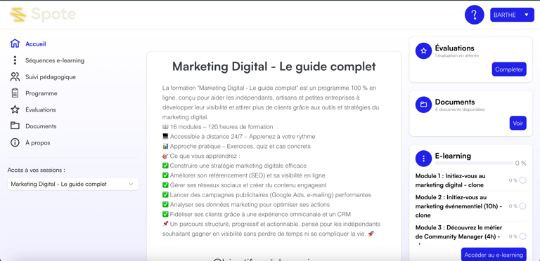 Chez Agence Spote, nous accompagnons les professionnels dans leur visibilité digitale. Aujourd’hui, nous mettons à votre disposition tout notre savoir-faire à travers une formation 100 % e-learning, certifiée Qualiopi et donc finançable par les dispositifs publics (OPCO, FAF, Pôle Emploi…).